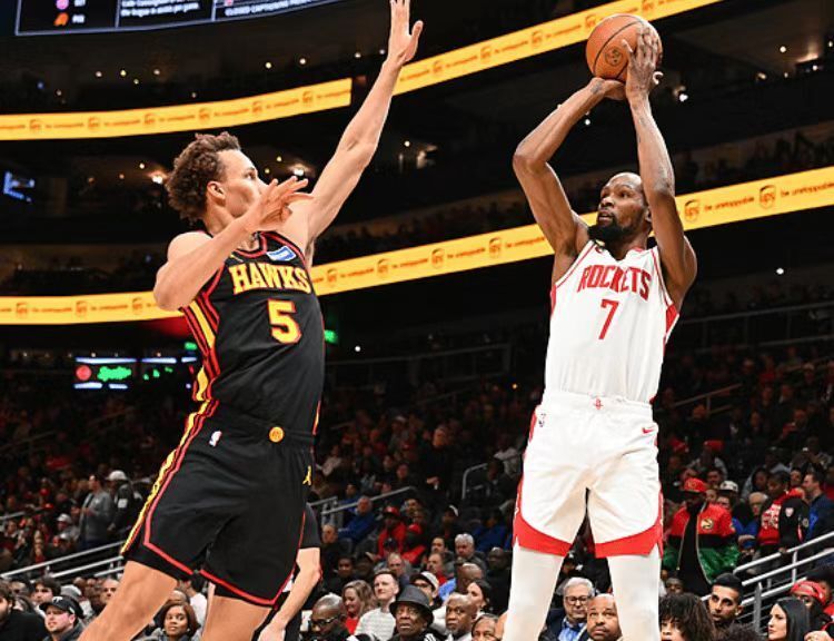 次节科洛克内线杀伤为老鹰取得领先,贾巴里史密斯内线扣篮回应,CJ命中三分,小霍乐迪和史密斯合砍3分回应,基斯波特突破杀伤,杜兰特和申京合砍4分反超了比分,亚历山大跳投命中,杜兰特和谢泼德合砍4分回应,双方在这一节打得依旧是非常胶着,分差一直在5分以内,节末阿门后仰跳投命中,火箭领先1分结束上半场。