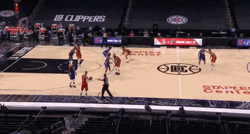 该战术是哈登在火箭时期,德安东尼为其量身定制的关键球战术。上图,内内高位接球后,后场的哈登摆脱贴防后,接内内传球杀入篮下造成杀伤,获得罚球。
