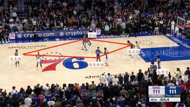 乌布雷负责边线发球,马克西后场落位,恩比德罚球线落位,乔治和埃奇库姆则在弧顶左右两侧落位,场上四人形成篮球战死里的钻石落位。