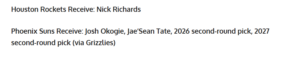 太阳得到:奥科吉+泰特+26年二轮签+27年二轮签。