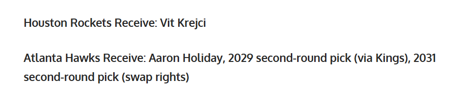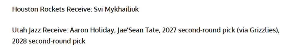 爵士得到:霍勒迪+泰特+27年二轮签+28年二轮签。