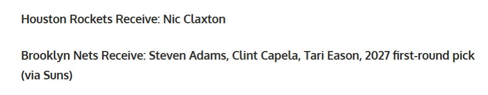 篮网得到:亚当斯+卡佩拉+伊森+27年太阳首轮签。
