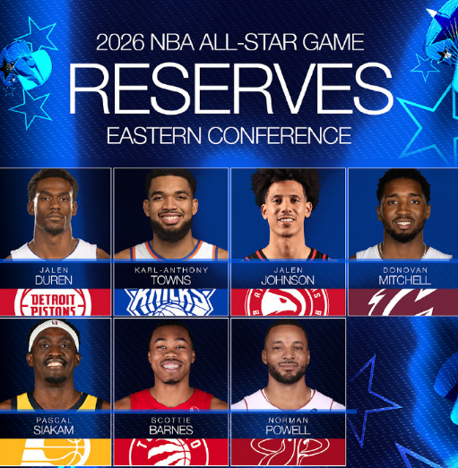 东部替补:米切尔、唐斯、杰伦-约翰逊、西亚卡姆、鲍威尔、巴恩斯、杜伦