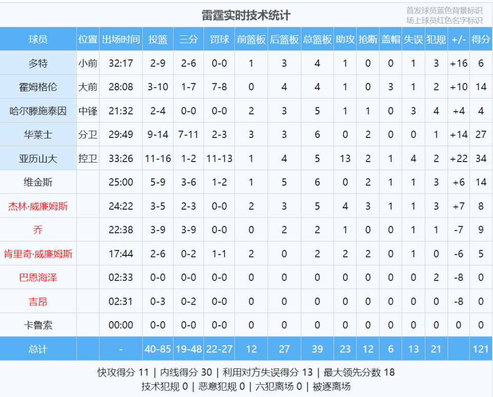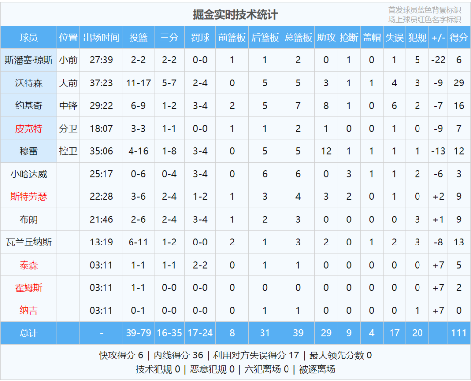 卡森-华莱士三分11中7砍下27分6板2断,得分和三分命中数都是生涯最高。掘金全场比赛从未领先过,此役过后跌至西部第三。最后看看数据: