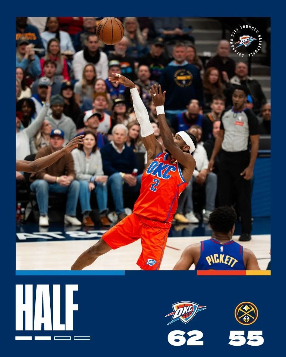 雷霆单节39分,三节打完,雷霆101-85领先掘金16分。亚历山大前三节得到27+5+12,约基奇14+3+7,华莱士也有23分进账。两队三分命中率都超过四成:掘金24中11,雷霆36中18。穆雷前三节投篮15中4,三分只有8中1。