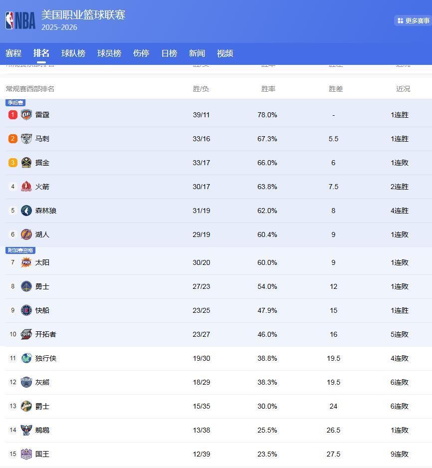 西部纠缠比较激烈的,还有森林狼31胜19负,湖人29胜19负,太阳30胜20负,3队都有拿下第5的机会!