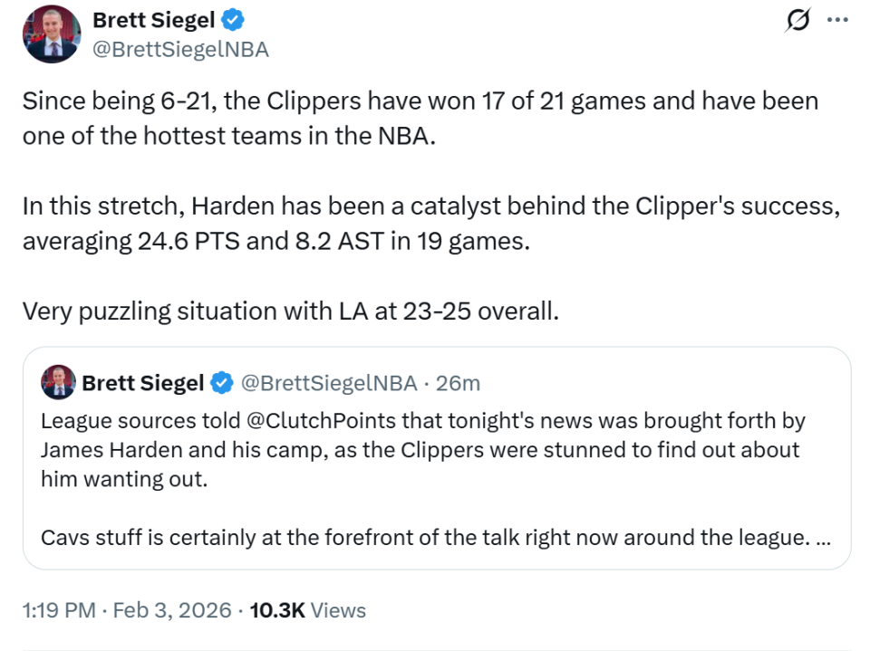 ESPN名记Shams随后发文确认消息真实性,同时跟进表示哈登与快船双方都在讨论能否在交易截止日前离队,并且双方都在寻找感兴趣的下家进行讨论。