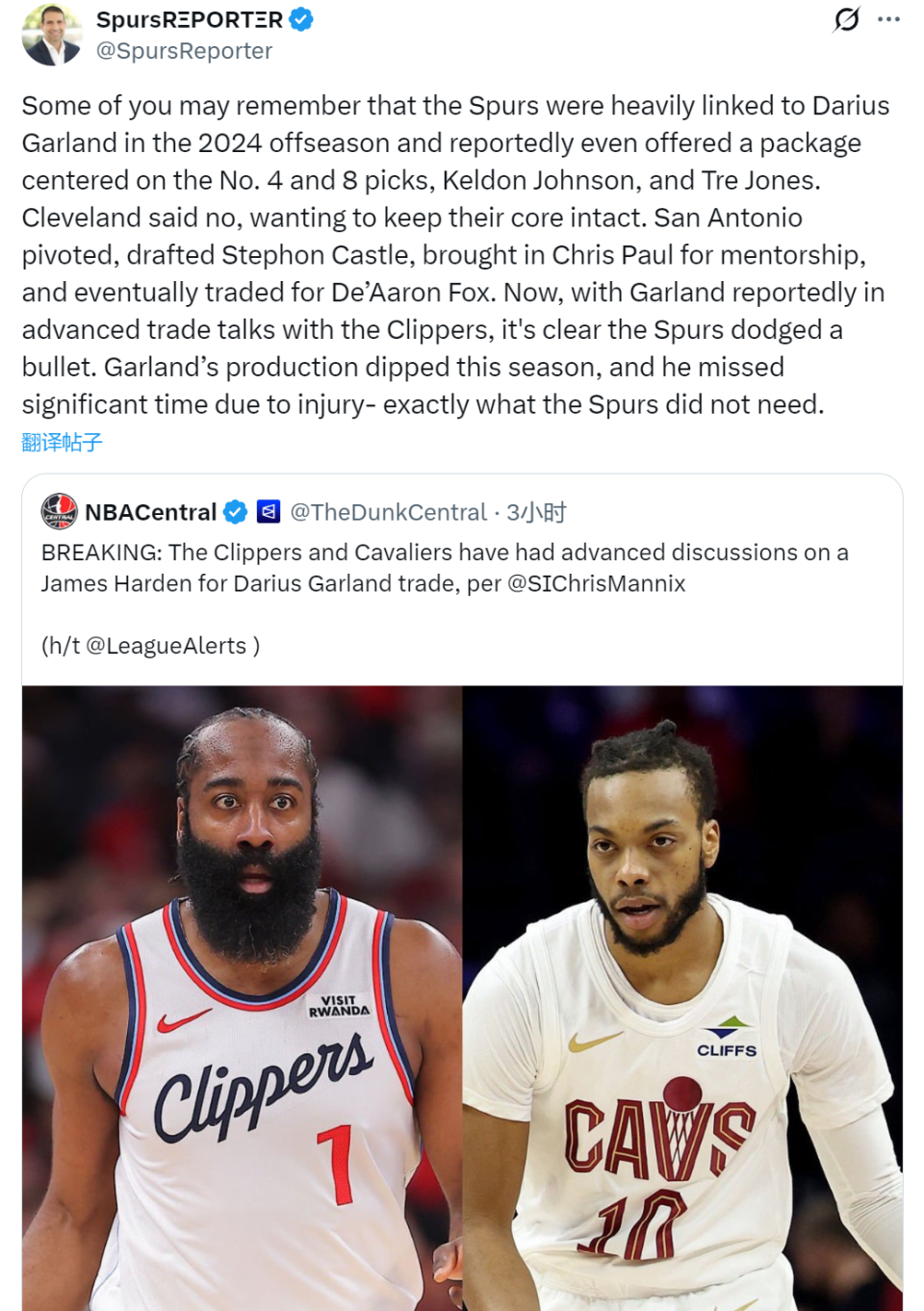 你没看错,据The Athletic记者Tony Jones和Sam Amick联合报道,快船和骑士能否达成交易,取决于快船是否愿意搭上首轮签。马刺记者Dusty Garza转发报道,并写道:2024年休赛期,马刺曾经接近得到加兰,骑士否决了交易。