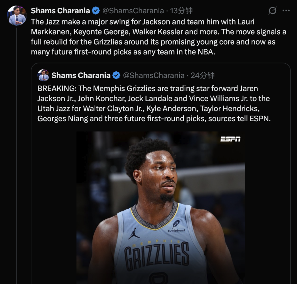 爵士孤注一掷获得小贾伦-杰克逊,球队将让他与马尔卡宁、基扬特-乔治、凯斯勒等年轻球员组成重建组合。此举标志着灰熊将围绕其潜力无限的年轻核心阵容进行全面重建,并且如今他们拥有的未来首轮选秀权数量在NBA所有球队中名列前茅,灰熊未来7年将拥有12个首轮签,仅次于篮网和雷霆。