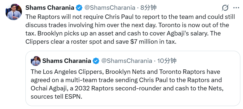 篮网得到:阿巴基、猛龙2032年次轮签、350万现金