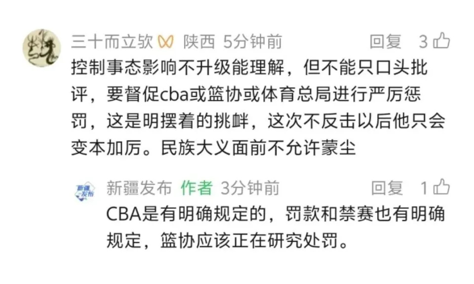 更严重的是,新疆维吾尔自治区新闻办公室官方公众号《新疆发布》直接下场发文,不点名却字字直指赵睿,甚至在评论区搬出篮协纪律准则,直言此类歧视言行该停赛直至追究法律责任。30岁的赵睿,这次是真的闯了大祸。