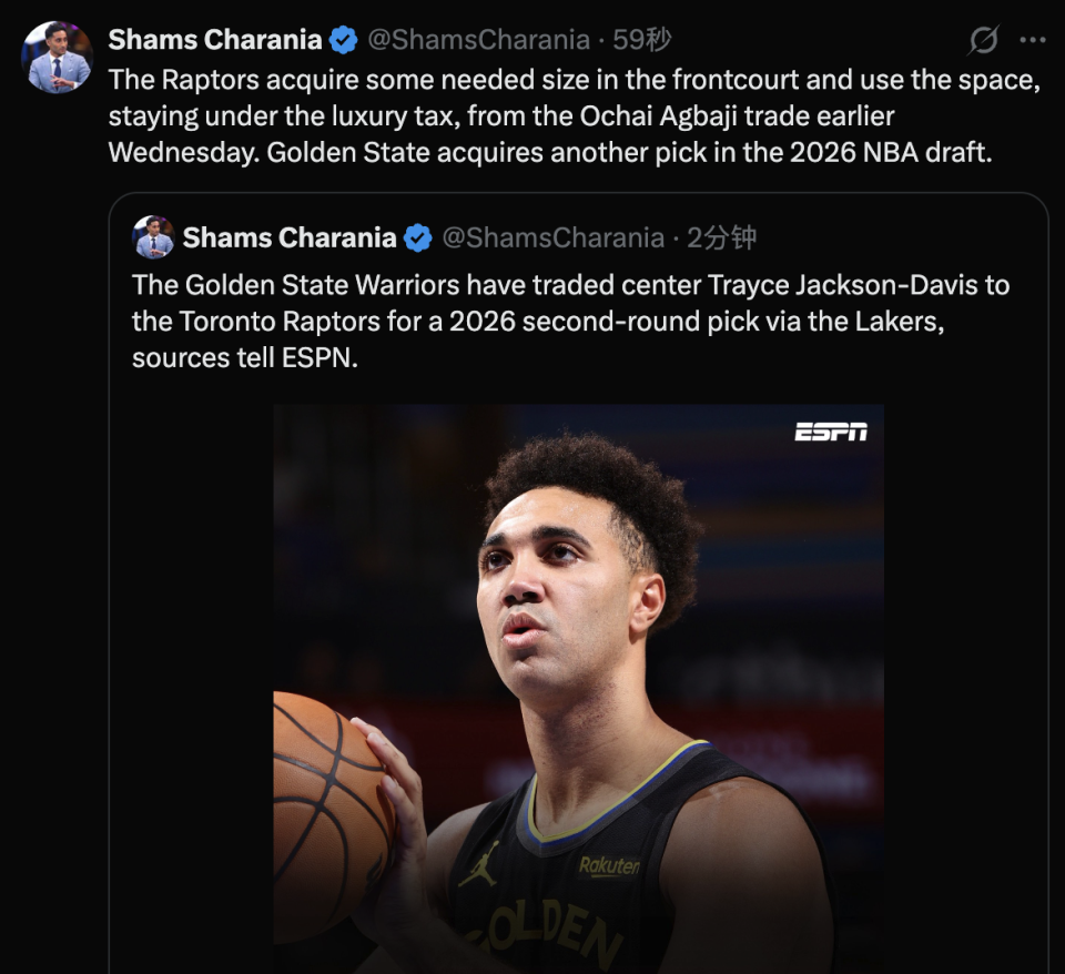 至于TJD的交易,猛龙早些时候送走阿巴吉,因此他们在前场急需身高优势,将目标锁定在TJD身上,并利用阿巴吉的交易腾出空间,成功避免了缴纳奢侈税。勇士则获得了2026年NBA选秀大会的另一个选秀权。