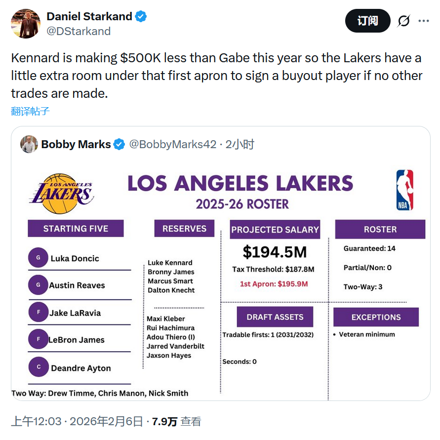 据湖人队记Daniel Starkand跟进报道,肯纳德本赛季的年薪比文森特少了50万美元,这为湖人在没有其他交易的情况下签下买断球员提供了一点额外的空间。本赛季,肯纳德年薪1100万美元,文森特年薪1155万美元。
