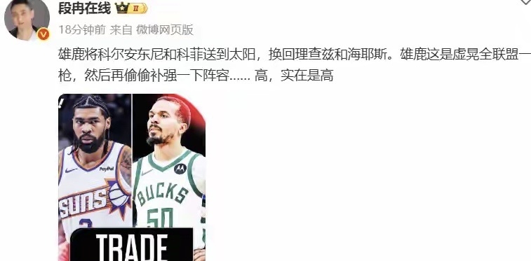而雄鹿这边也没闲着,前脚刚官宣不交易字母哥,后脚就和太阳完成了一笔2换2的交易,把科尔-安东尼和科菲送到太阳,换回了理查兹和奈奈尔-海斯-戴维斯。这笔交易说白了就是角色球员互换,对球队的争冠前景几乎没什么影响,更像是雄鹿在戏耍全联盟之后,顺手做的一笔小修补。