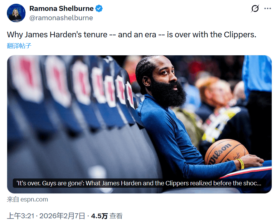 北京时间2月4日,NBA常规赛继续进行。在之前一笔交易中,哈登被送到了骑士队。在今天早些时候,名记Ramona Shelburne撰文揭秘了交易过程,也揭开了哈登“回家”失败的真相,火箭队对他兴趣并不大。