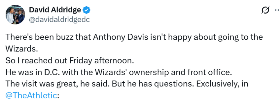 体育画报资深NBA记者曼尼克斯曾在报道中称,戴维斯“似乎对加盟奇才兴致不高”,并在播客节目中再次强调这一观点。但戴维斯表示,目前所见的一切都让他心生好感。