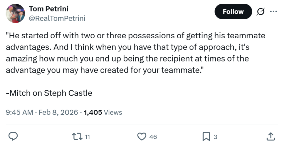 卡斯尔在打出生涯之夜后则感谢了球迷的支持:“能够拥有这座城市与球迷的爱,让我登场打球都会美好的有些不真实感,尤其是在职业生涯还很年轻的时候,真的是太特别了。”