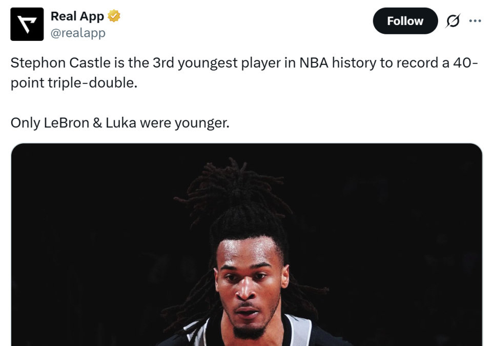 同时卡斯尔才21岁零98天,这让他打破此前由大O(22岁33天)保持的历史纪录,成为NBA历史上单场拿到至少40分12板12助最年轻的球员。