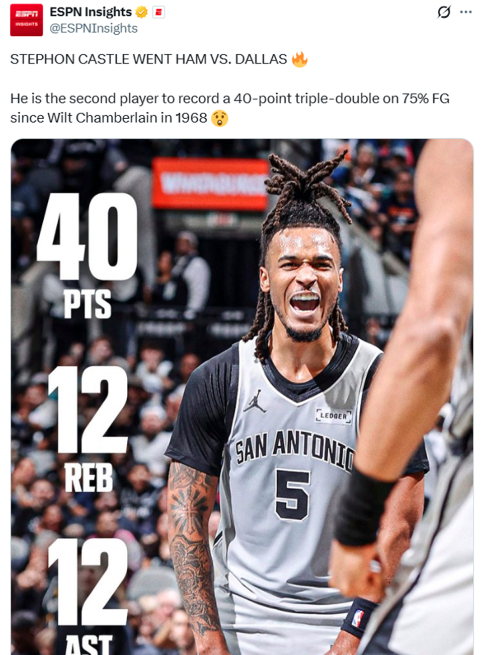 凭借这样的表现,卡斯尔打破尘封58年之久的神纪录,成为NBA历史上第二位以至少75%命中率拿下40+三双的球员,比肩1968年的张伯伦。