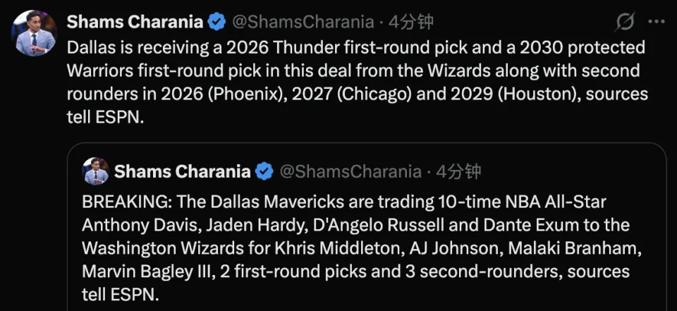 在交易截止日前,独行侠将浓眉、杰登-哈迪、德安吉洛-拉塞尔以及埃克萨姆交易至华盛顿奇才,换来米德尔顿、AJ-约翰逊、布兰纳姆、巴格利、2个首轮签和3个次轮签。这笔交易对于双方而言都是双赢的。独行侠不仅将浓眉送走,还同时打包了赛季报销的埃克萨姆以及掉出轮换的后卫拉塞尔,至于杰登-哈迪完全具备轮换球员的实力,本赛季场均贡献6.9分1.4篮板,但是在克里斯蒂、马绍尔等竞争者面前,他平凡的实力,逐渐被教练组边缘化。