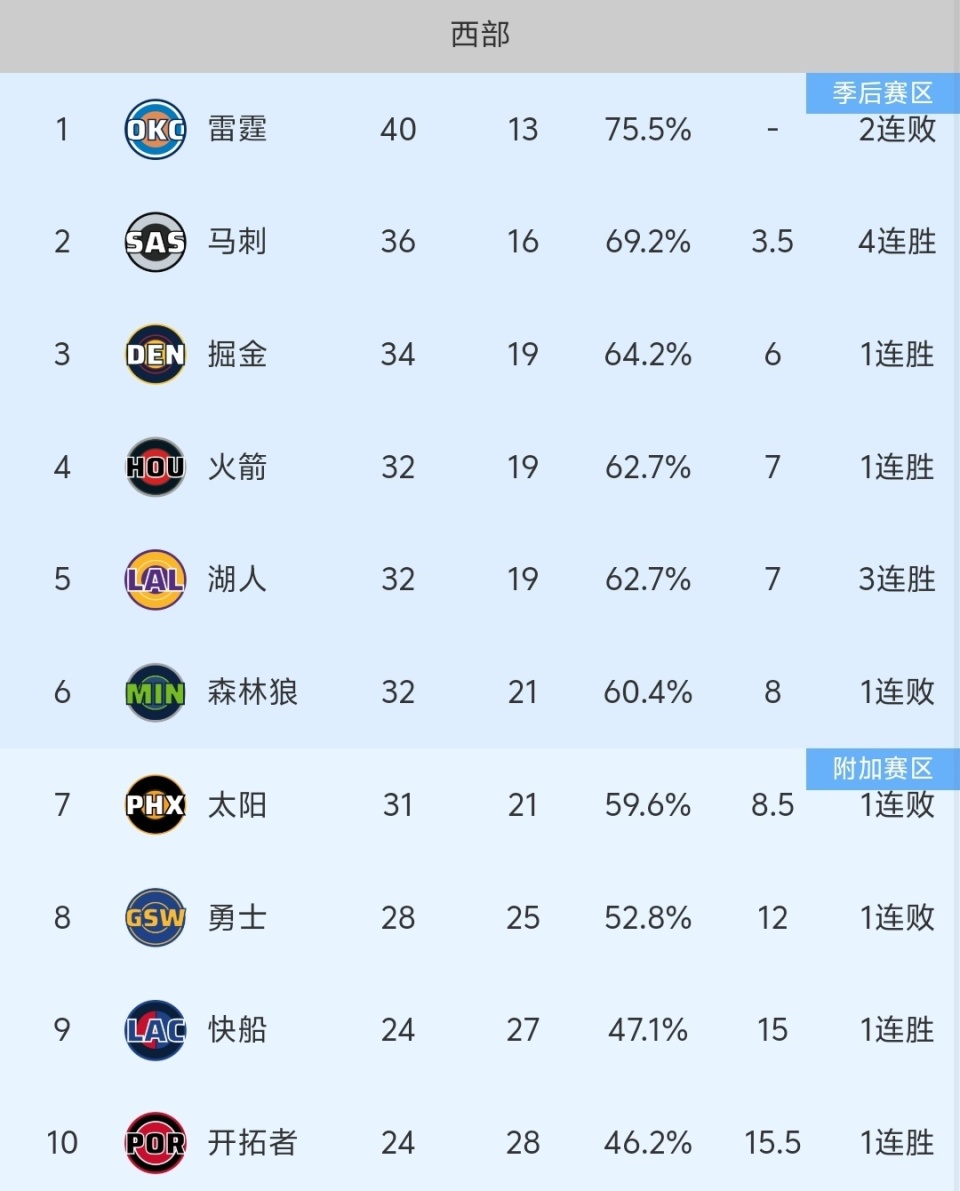 随着湖人105-99险胜勇士、马刺火箭赢球,NBA最新积分榜:西部2-5名太乱!