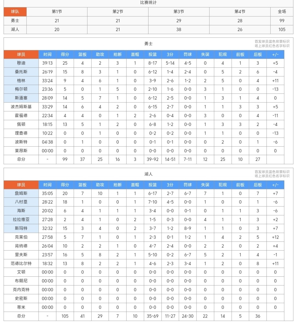 下半场第三节易边再战,湖人队詹姆斯带队掀起进攻高潮,他们多人爆发单节轰出38-29的比分,领先8分进入末节,第四节勇士队锲而不舍开始追击比分,比赛依然很紧张胶着,他们一度迎头赶上,不过湖人很快又拉开了比分,最终湖人拿下了胜利!