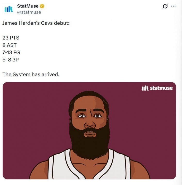 美媒StatMuse晒出了哈登数据,并写道:“体系已经到来。”