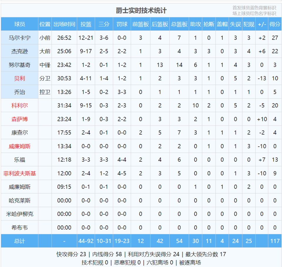 再来看看四节比分(爵士在前):30-33、35-21、29-33、23-33。大家可能发现一个问题,爵士第四节崩盘了,而且两个核心马尔卡宁和3J出场都不到27分钟。没错,第三节还剩3分24秒,马尔卡宁被换下,当时爵士尚且领先7分。
