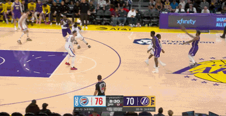 半场战罢,雷霆67-58领先湖人9分。湖人上半场三分球15中4,其中第二节单节6中1。以赛亚-乔半场7中6高效砍下16分,湖人里夫斯12分6助,詹姆斯8分2篮板3助攻3失误。易边再战,詹姆斯连续砍分,第三节单节4中3得到10分。