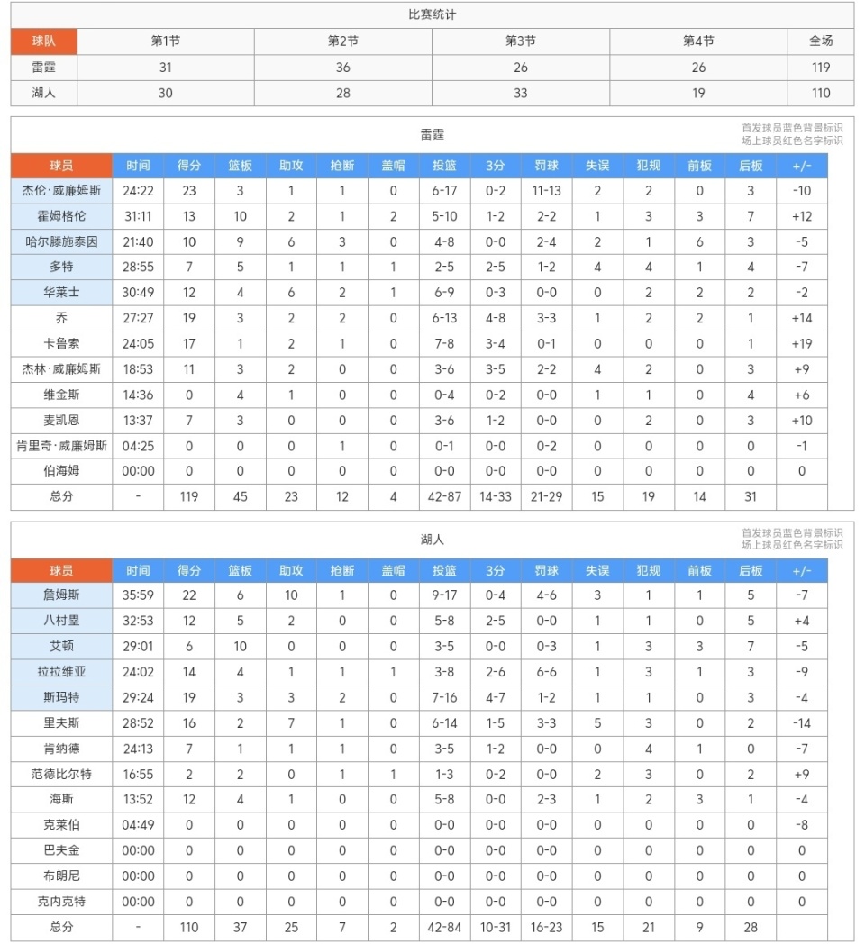 第一节詹姆斯出手不多,雷霆的防守到位很快,老詹更多的选择了传球,好在湖人的得分点比较分散,大家都能挺身而出,替补席的里夫斯上来连拿9分,雷霆这边霍姆格伦与杰伦威廉姆斯都还在找手感,哈腾与替补席的乔打得不错,两队基本上是对攻的局面,首节湖人30-31落后雷霆!