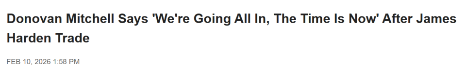 “你能看到这支球队的实力。我们有争冠窗口,这就是窗口期,就是现在。”米切尔在接受采访时说,“从某种意义上说,球队已经全力出击。是时候冲了。当你做出这笔交易,就明白哈登的年龄和职业生涯阶段——机不可失。”