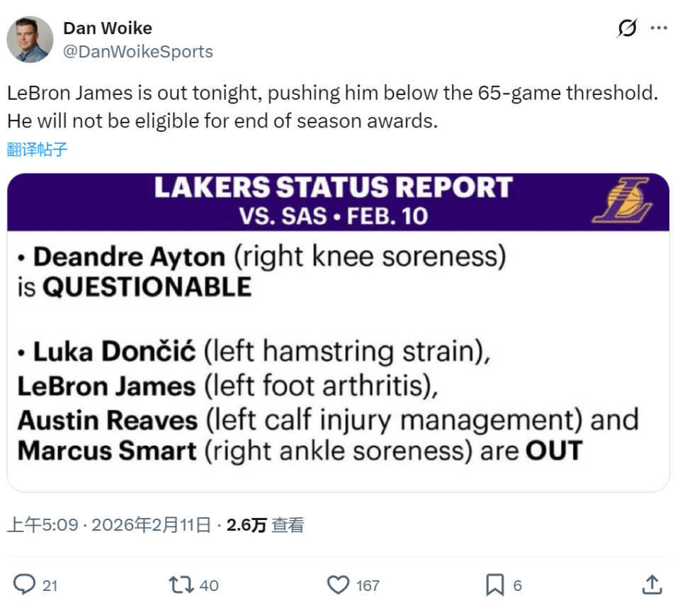詹姆斯无法出战65场常规赛以上,失去常规赛重要奖项的评选资格。连续21年入选最佳阵容的历史纪录,正式终结了。詹姆斯生涯首次入选最佳阵容是2004-05赛季,当时跟他一起入选二阵的有加内特、韦德、雷阿伦和斯塔德迈尔。