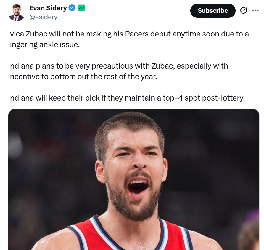 否则步行者也不会在交易截止日前大手笔引进祖巴茨,后者在赛前被记者Evan Sidery曝出受困于脚踝伤势,短期内不会迎来球队首秀。