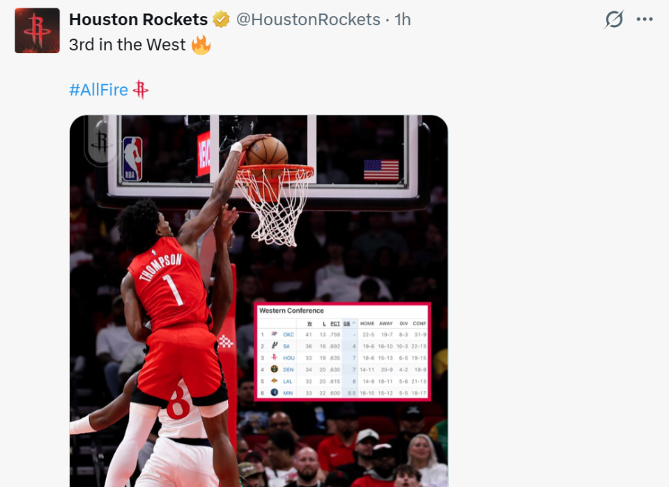拿下2连胜后火箭队战绩提升至33胜19负,成功反超掘金队升至西部第三,对于一直遭遇困境的火箭队来说,无疑是一针强心剂。
