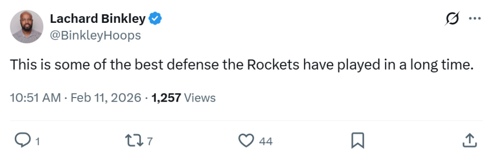 全场火箭队仅让快船队拿下95分,末节更是大半节仅让快船队拿下4分直接收割胜利,赛后队记Lachard Binkley也称赞道:“这是火箭很久以来打出的最棒防守表现之一。”