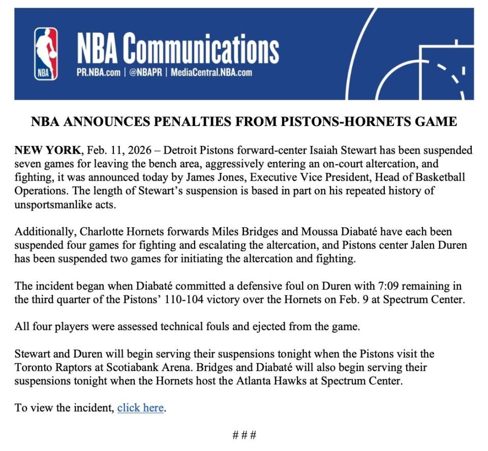 北京时间2月12日,NBA官方公布重磅罚单,由篮球运营执行副总裁兼主管詹姆斯-琼斯宣布,活塞与黄蜂爆发激烈冲突的4名涉事球员,即活塞的杜伦、斯图尔特,黄蜂的迪亚巴特和布里奇斯,均处以不同程度的无薪禁赛。斯图尔特因离开替补席区域、积极参与场上冲突以及打架而被禁赛7场,斯图尔特的禁赛时长部分基于他此前多次违反体育道德的行为记录。此外,迪亚巴特和布里奇斯因打架和加剧冲突分别被禁赛4场,杜伦因挑起冲突和打架被禁赛2场。