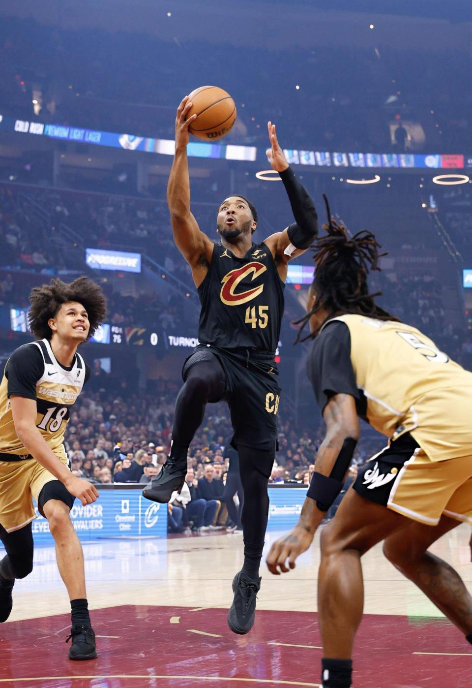 末节决战,汤姆林扣篮得手,哈迪两罚全中,汤姆林再次扣篮命中,哈迪命中三分。米切尔打成2+1然后跳投得手,沃特金斯和尚帕尼连续命中三分。随后梅里尔连续命中两记三分,阿伦两罚全中,骑士队保持20分左右的分差。暂停之后,奇才队和骑士队纷纷换下主力球员,比赛彻底失去胜负悬念,骑士队主场收获大胜。