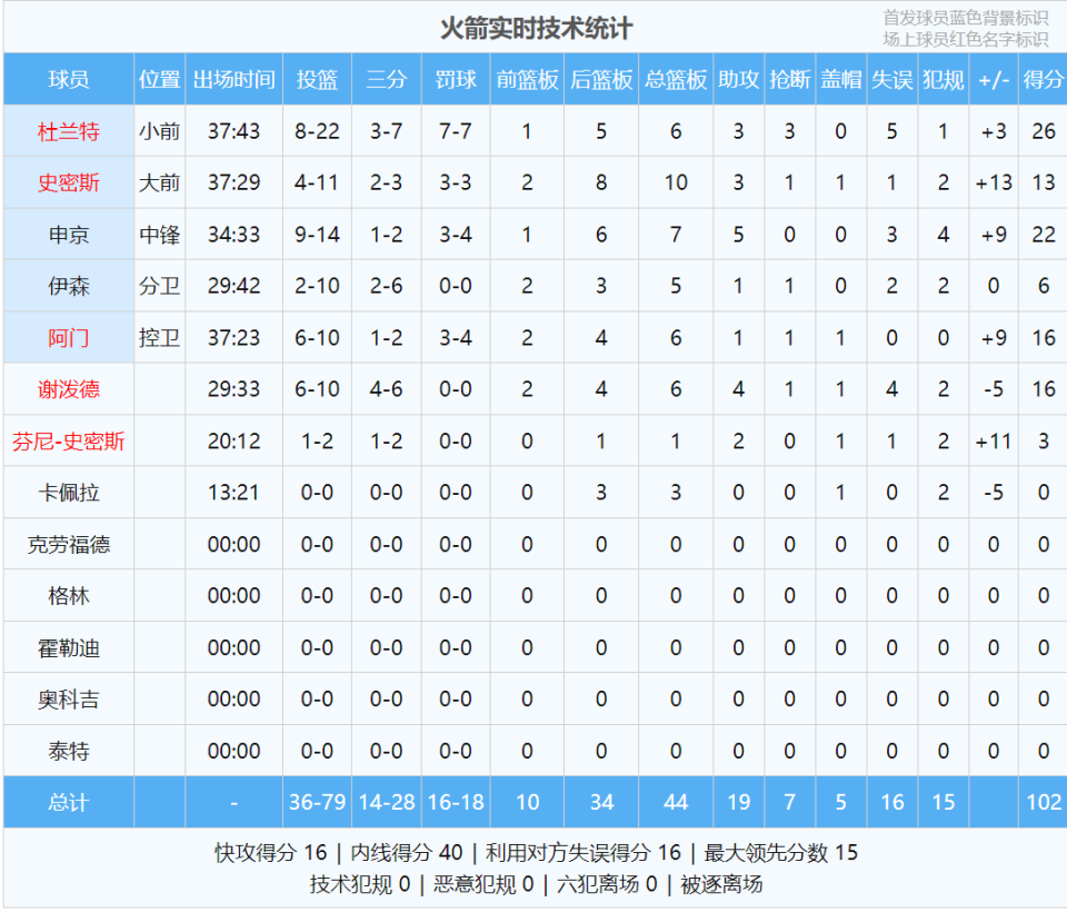 此役过后,火箭升至西部第三,落后第二的马刺3个胜场。最后看看数据: