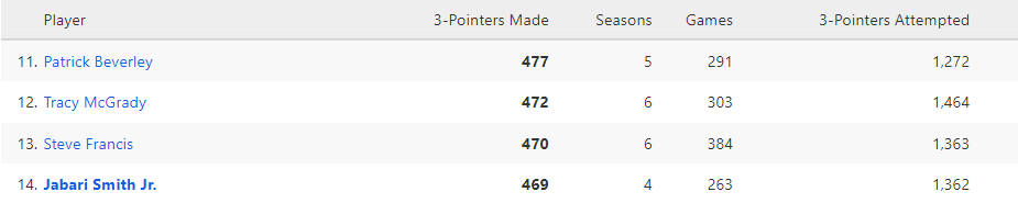 小贾巴里-史密斯三分命中数(470+)超过弗朗西斯升至队史第13位。