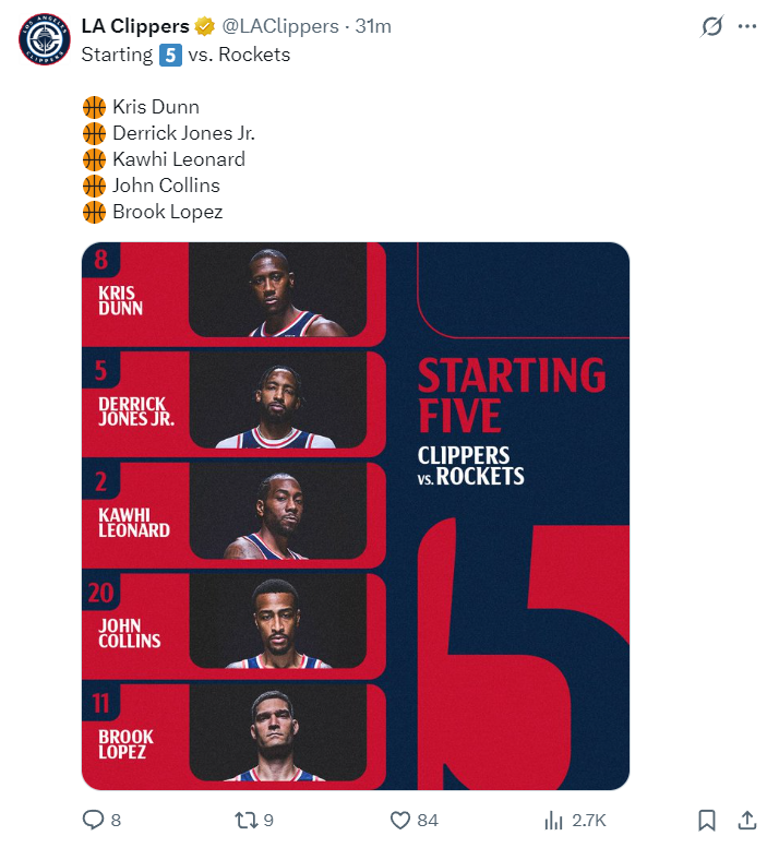 快船:邓恩、琼斯、莱昂纳德、科林斯、洛佩斯;
