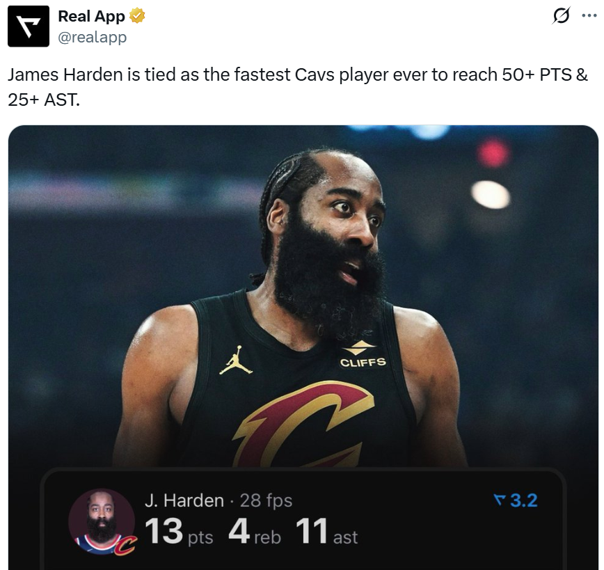 在轻松划水的情况下,哈登加盟骑士前三场还是交出场均19.3分5.3板8.7助1.3帽全能表现,这让哈登并列成为骑士队史达成50+得分和25+助攻最快球员。