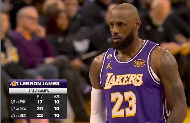 41岁的詹姆斯连续4场比赛助攻上双,超越斯托克顿创NBA历史40岁或以上球员,历史最长连续助攻上双纪录。