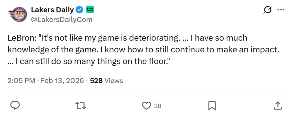 面对詹姆斯如此傲人的表现,湖人名宿沃西感叹道:“当你认为詹姆斯可能会在全明星周末到来之际放松一下时,结果他一上场就拿了个三双。”