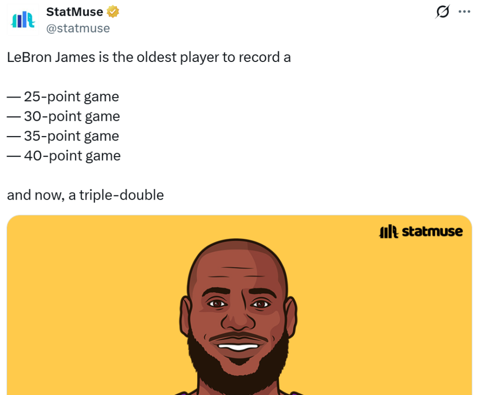 纪录二:本场比赛是詹姆斯本赛季首次拿到三双,这让41岁45天的詹姆斯超越03年40岁127天马龙创造的NBA历史纪录,成为NBA历史上拿下三双最老的球员。