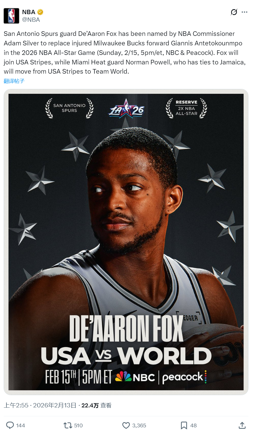 北京时间2月13日,NBA官方宣布:雄鹿球星字母哥正式退出本届全明星正赛,马刺后卫福克斯递补字母哥出战全明星。同样是今天,奇才榜眼亚历克斯-萨尔因伤退出全明星新秀赛,奇才后卫卡尔顿-卡林顿顶替萨尔出战新秀赛。
