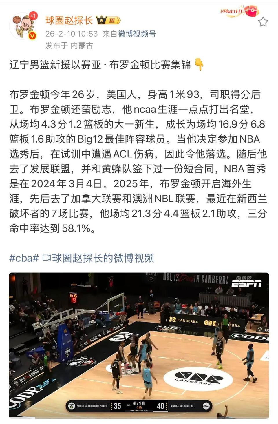 加盟辽宁之前,布罗金顿效力于澳大利亚NBL联赛新西兰破坏者队,场均可以贡献15.8分3.9篮板2助攻,命中率可以达到50%,还上演过隔扣麦基的名场面!舍不得孩子套不着狼,辽宁终于签下了一位高水平外援,即战力非常强!CBA其实就是靠外援的联赛,只需要一名超级小外援就足够,可以起到以点带面的效果。第二阶段才是真正的竞争,很多俱乐部都补强了外援,希望辽宁在第二阶段可以提高排名,确保进入季后赛。