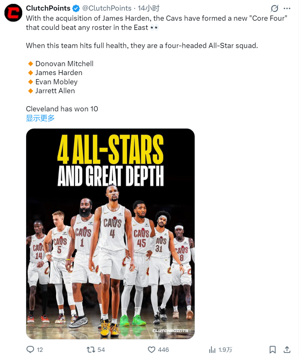 北京时间2月14日,美媒ClutchPoints发推写道:“骑士组成了能够击败东部任何球队的‘核心四人组’,他们拥有四个全明星球员,米切尔、哈登、莫布利和阿伦。骑士的夺冠拼图已经凑齐,过去11场比赛,骑士10胜1负联盟最佳!”