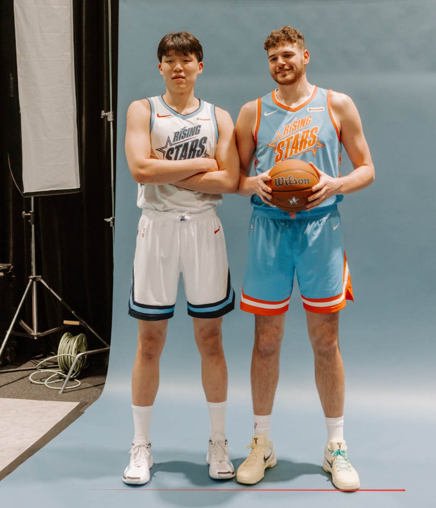 在克林根与杨瀚森一同拍全明星定妆照能感觉出杨瀚森与克林根的尺寸差距似乎在缩小,克林根裸足是2.18米,杨瀚森裸足是2.16米,两人拍照时克林根还站在更前面的一点的位置,感觉两人已经一般高,对于中锋来说尺寸、吨位是硬性标准。