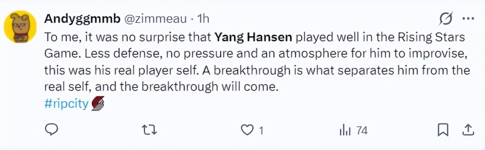 拓媒Ripcityy也发声祝贺杨瀚森在全明星赛起飞。