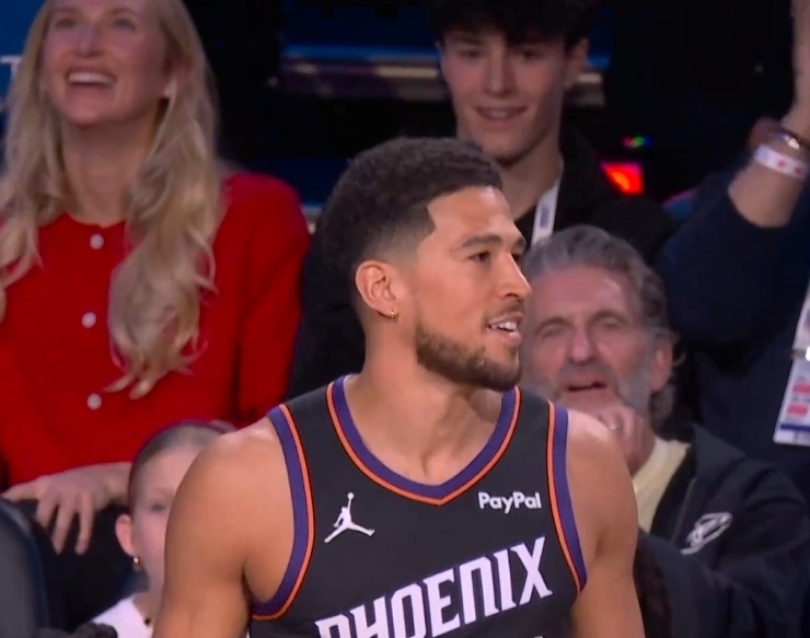 第七位登场的是卫冕冠军布克,他第一个点命中4球,左侧弧顶5中5表现出色,但随后超远球不中。布克中路命中3球,右侧超远球也不中,右侧弧顶命中4球,最后花球点再中4球,布克得到30分表现出色。